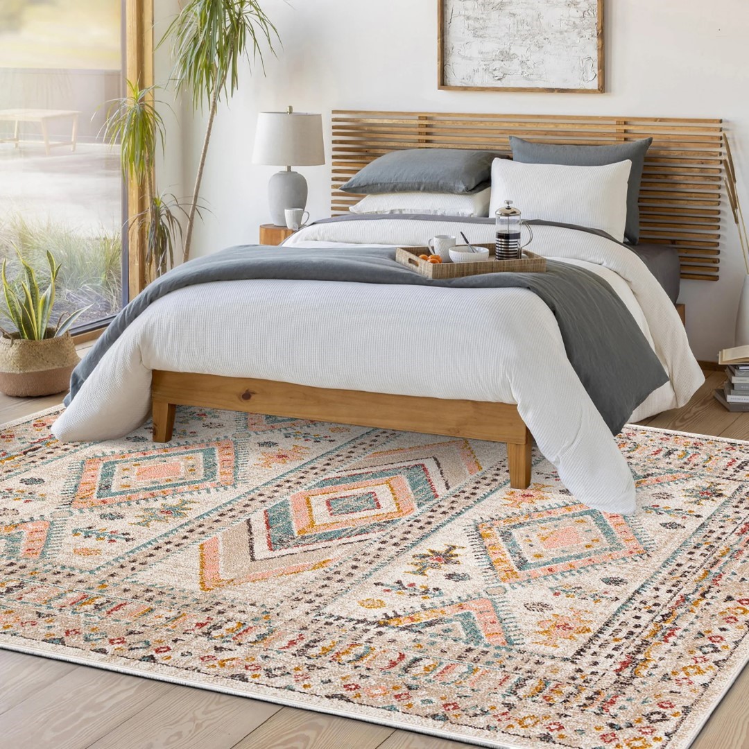 Na pierwszy rzut oka dywan przyciąga wzrok swoim misternym, geometrycznym wzorem, który opowiada historię. Motywy przypominające dawne wzory plemienne lub popularny styl ikat są celowo „postarzone”, co nadaje całości autentyczny, pełen charakteru wygląd.